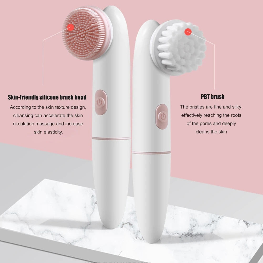 This facial cleansing brush comes with two interchangeable brush heads: a soft fiber brush and a silicone brush. The fiber brush is perfect for removing oily dirt, facial cuticles, and blackheads, making it suitable for all skin types. The silicone brush head offers a gentle and soothing touch, ideal for sensitive skin, ensuring a customizable and comfortable cleansing experience.